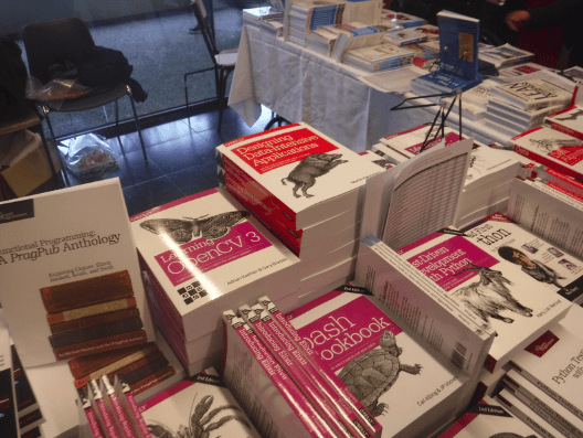 le stand d’O’Reilly est couvert de livres passionnants. Il ne faut pas compter payer par carte bleue, le réseau gprs sur lequel s’appuie le terminal de carte est saturé à cause du nombre de participants