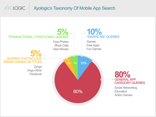 Ces chiffres sont certes déjà connus, la surprise ici pour moi c'est que la recherche sur les Stores est aujourd'hui mal utilisée. Je savais la recherche Apple très limitée (l'équivalent du meta keywords) mais il semblerait qu'elle soit en fait à la hauteur de l'utilisation qui en est faite ! La plupart des recherches se font aujourd'hui sur des catégories, par exemple 'jeu arcade', 'réseau social', 'jeu gratuit' ! Donc on peut en fait résumer la recherche sur l'App Store au Top 25 de l'App Store ou de la catégorie. Pour aller plus loin j'ai trouvé ce graphique sur le blog de Xyologic :