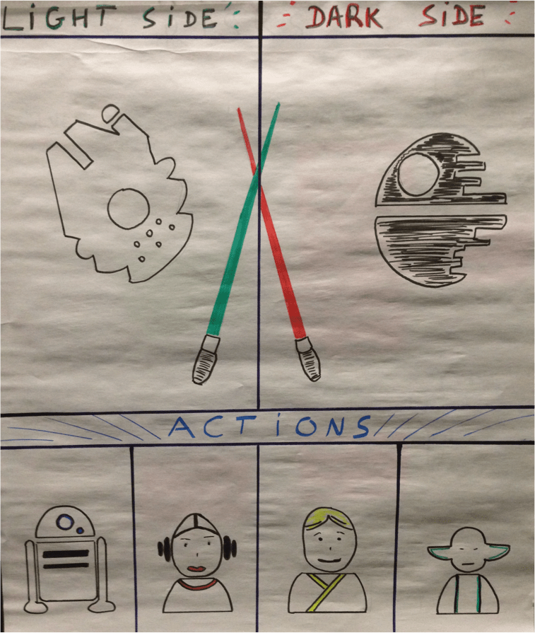 Considérez l'itération qui vient de s'écouler. Que considérez-vous comme étant du côté clair de la Force ? Et du côté obscur ? Ecrivez une idée par note repositionnable pendant 3 minutes. Puis venez les coller sur le poster en expliquant aux autres vos différents points.