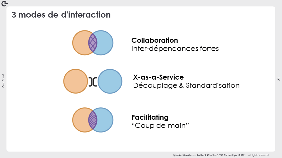 - X-as-a-Service : mode d’interaction favorisant le découplage et la standardisation. Un équipe met à disposition son produit via des interfaces standardisées. L’équipe productrice du service adopte une culture “produit”.