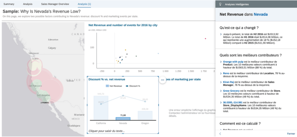 Par exemple, la technologie Smart Discovery permet de mettre le doigt sur les éléments pertinents du jeu de données. Il suffit de fixer quelques indicateurs et paramètres, et le moteur d’Intelligence Artificielle va opérer les corrélations et croisements puis générer directement un rapport. Une fois l’ébauche de rapport livrée, il sera possible de basculer en mode manuel pour creuser les pistes suggérées par le moteur d’IA. En cliquant sur une mesure (ici Net Revenue) on a 3 possibilités d’analyse: