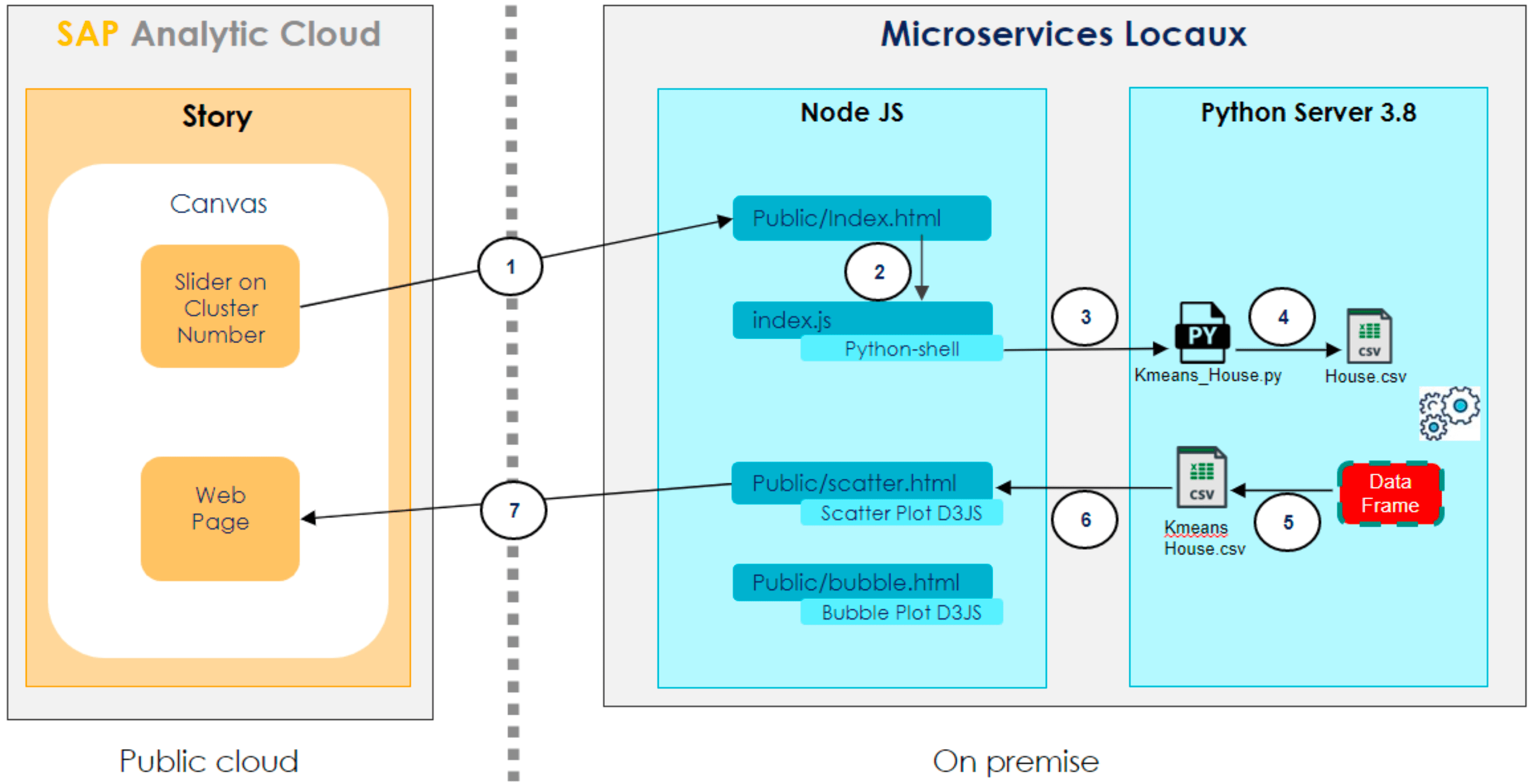 • Pour une industrialisation avec des volumétries plus conséquentes ou avec des SLA (temps de réponse) très courts, il faudrait plutôt s’orienter vers des modèles à faire tourner côté backend. Dans notre cas, il s’agirait d’exécuter l’algorithme K-means python sur les données présentes dans le même tenant HANA connecté à SAC.