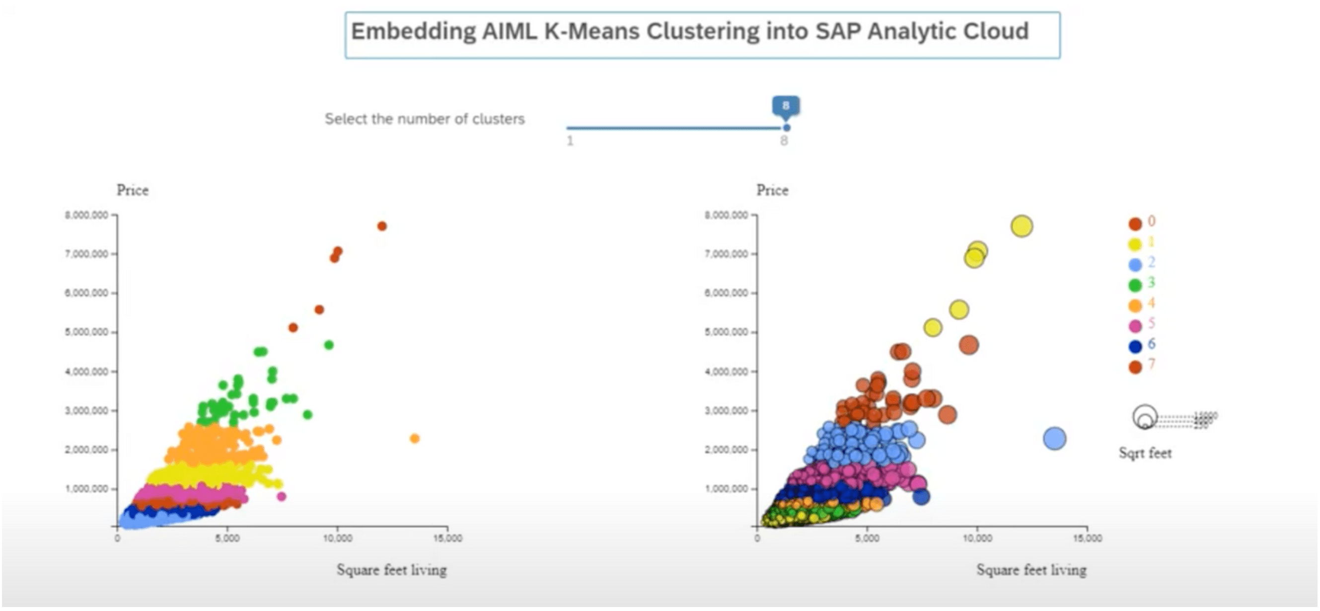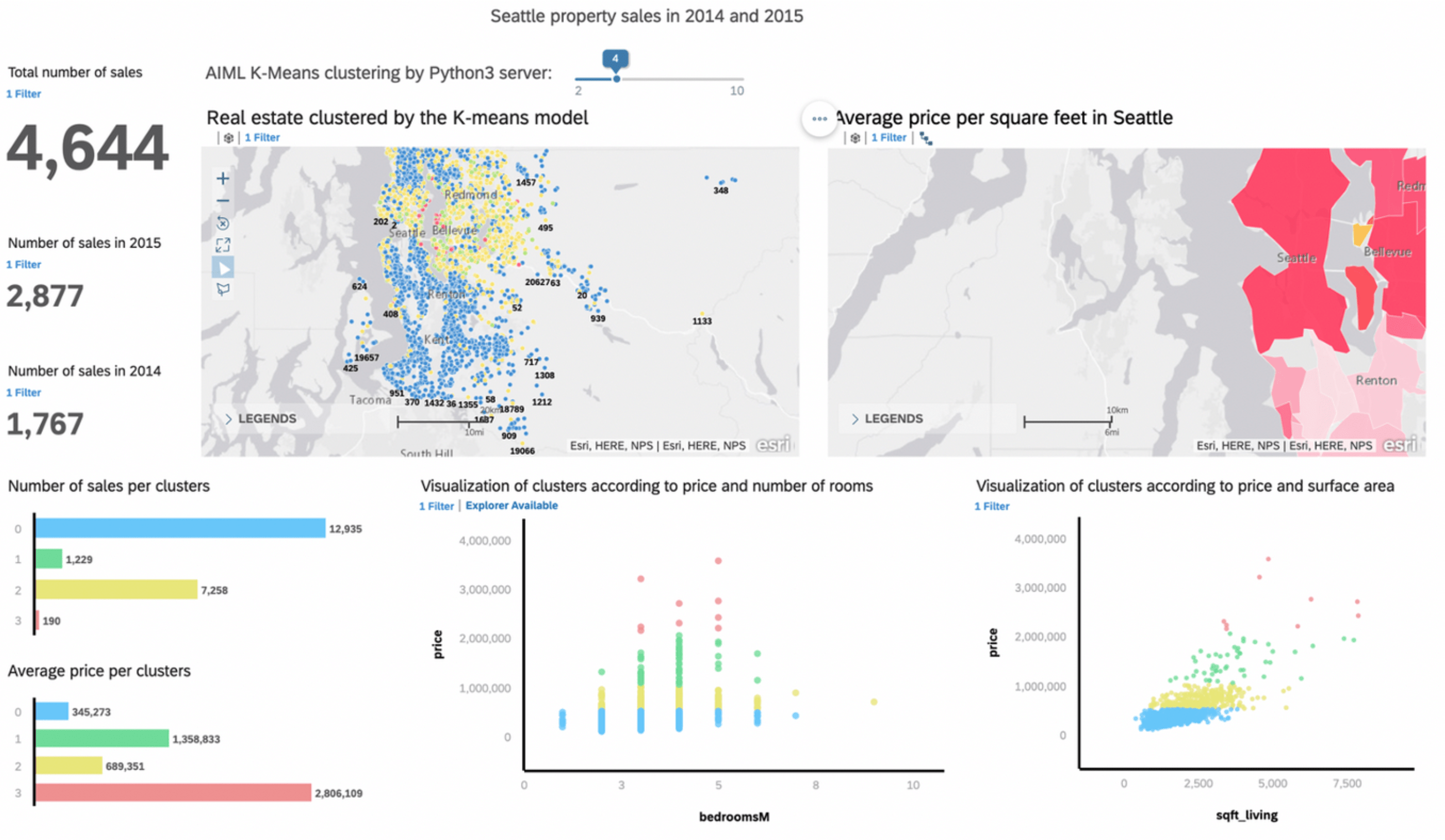Le dataset utilisé dans notre exemple se compose de données de ventes immobilières récupérées sur kaggle.com (jeu de données de bonne qualité mais avec peu de volumétrie). C’est sur ces données que l’algorithme K-means est appliqué au travers d’un paramètre dynamique, envoyé par SAC (valeur renseignée par un slider).