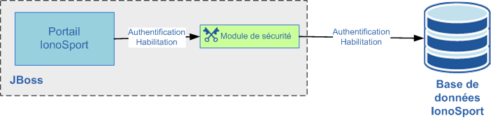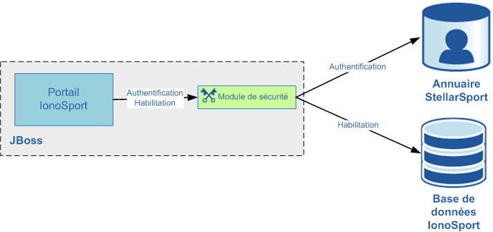 L'entreprise IonoSport possède un portail d'entreprise, déployé sous JBoss. Il a été choisi initialement que la sécurité de ce portail se ferait à l'aide des mécanismes natifs proposés par le serveur d'application, basés sur JAAS (plus d'infos ?). Chez IonoSport, la gestion des identités (ou GDI) a été déléguée à une base de données. L'authentification et l'habilitation du portail sont donc réalisées à l'aide des informations qui y sont stockées.
