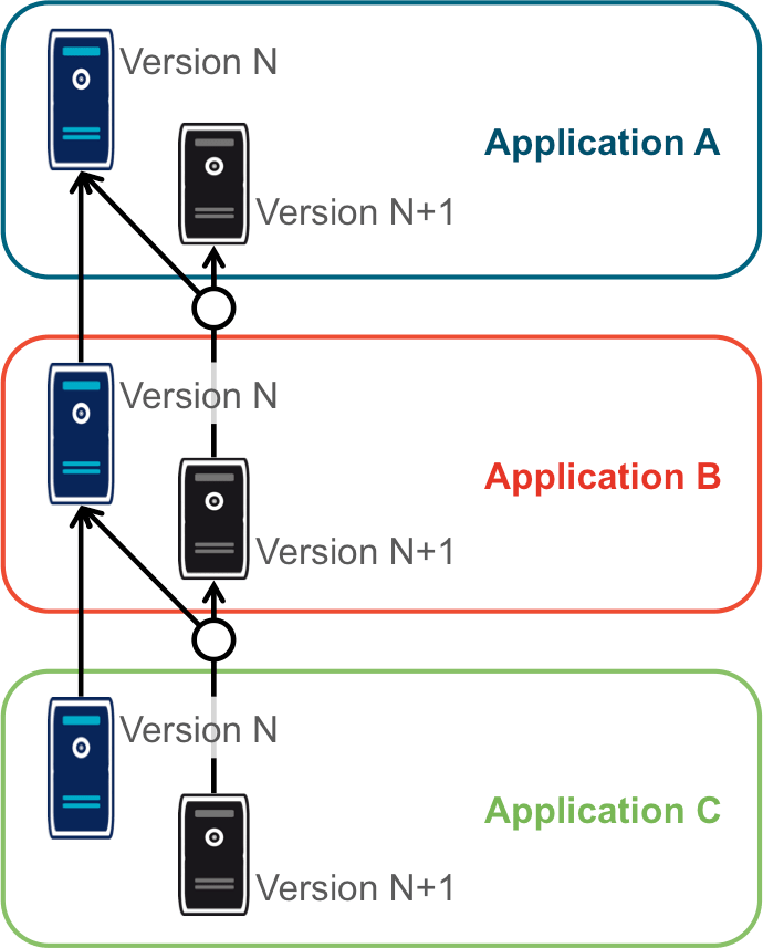 Chaque application choisit sur quelle version de service se brancher, ce qui supprime le problème de dépendance. Par exemple, la version N+1 de l’application B peut choisir d’utiliser la version N ou la version N+1 de A.