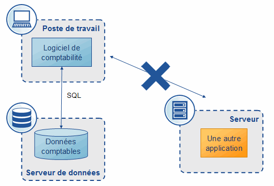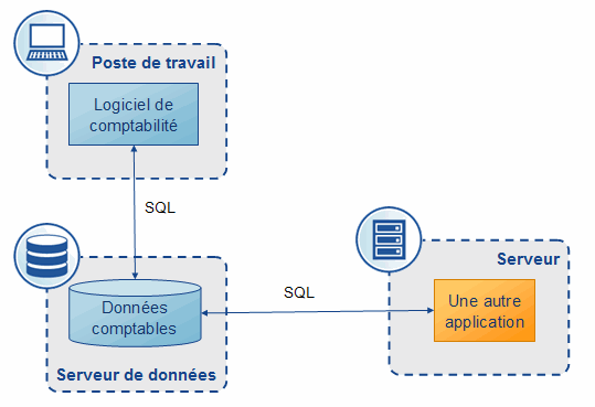 Prenons l'exemple d'un progiciel de comptabilité dont on souhaite exposer le référentiel de tiers au reste du SI. Il s'agit classiquement d'une application client / serveur déployée sur un ou plusieurs postes de travail avec en général une base de données hébergée sur un serveur de l'entreprise.