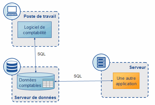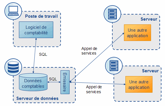 Vous n'avez probablement pas la main sur l'application cliente qui est livrée sous forme de binaire par l'éditeur ou l'intégrateur et qui propose souvent comme seul de communication un rudimentaire système d'import et d'export de fichiers actionné par l'interface utilisateur. Il n'est donc pas possible de faire une autre application avec le client de logiciel de comptabilité.