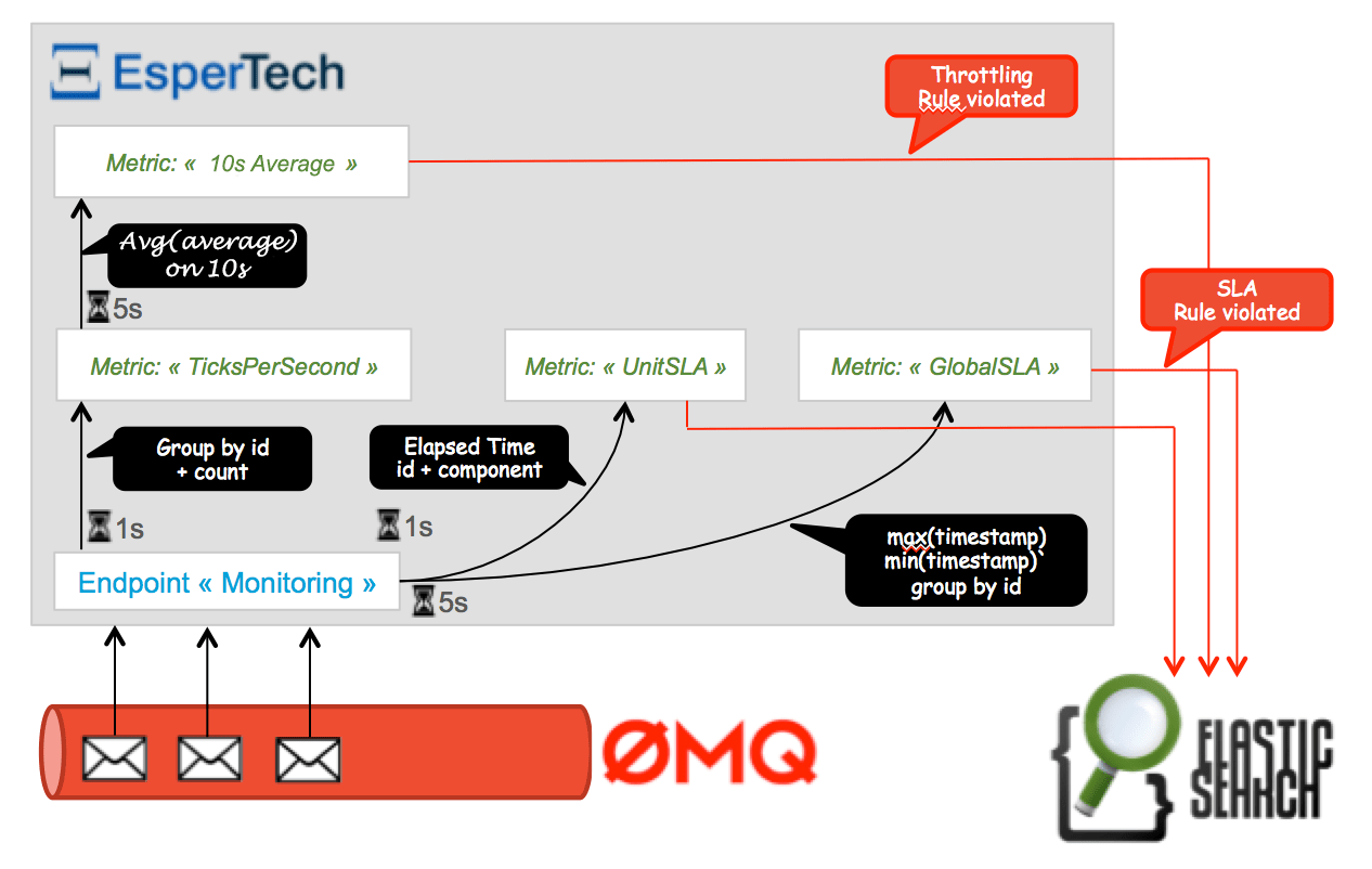 The flow of events is analyzed to build real-time indicators thanks to Esper Process Language (EPL) analytical language. These statuses are queried periodically to detect abnormal behaviors such as threshold violations.