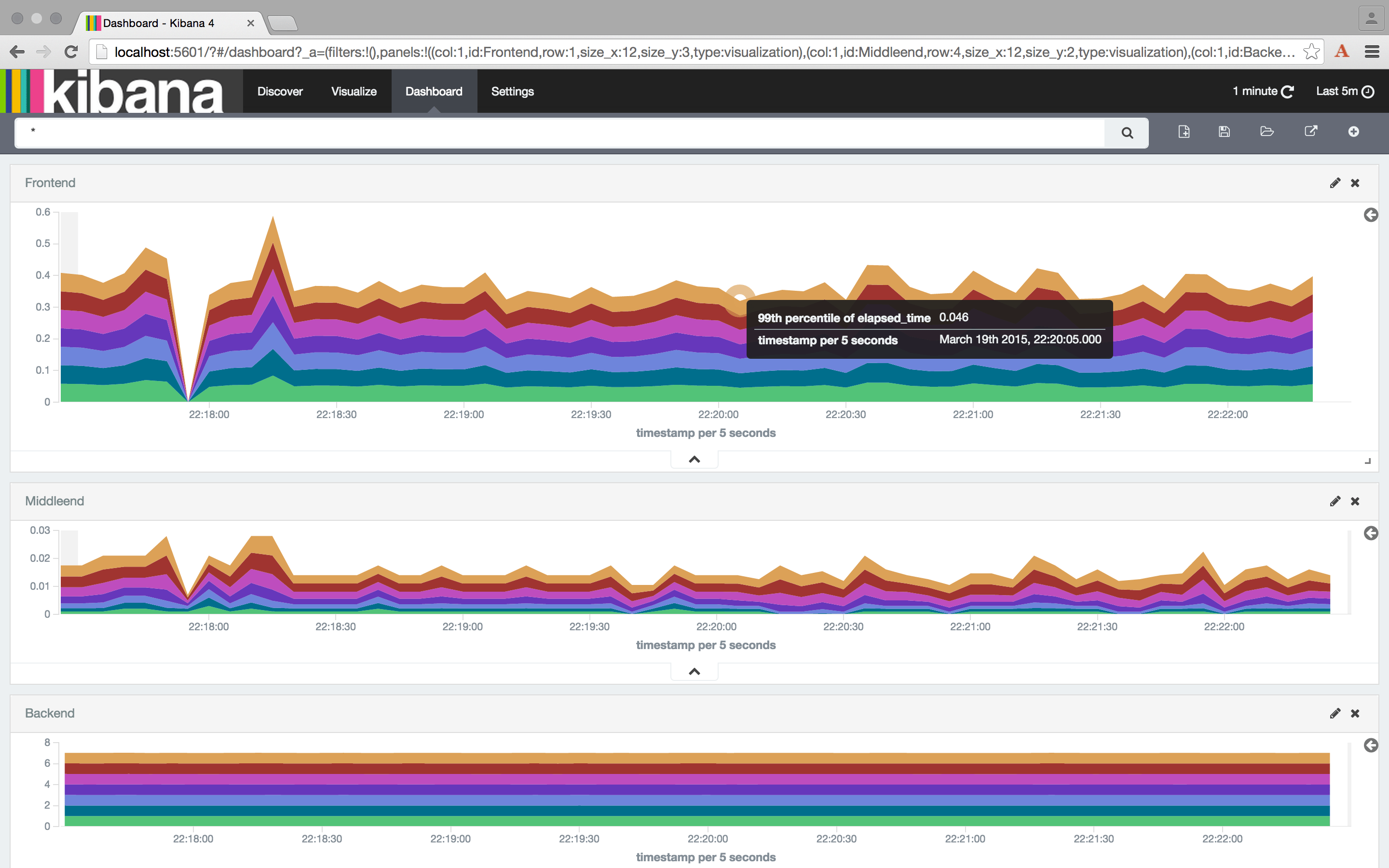 With the data already structured and stored in ElasticSearch, Kibana is the natural choice for the dashboard: assistant wizards make it easy to create various dashboards based on the data in the database.