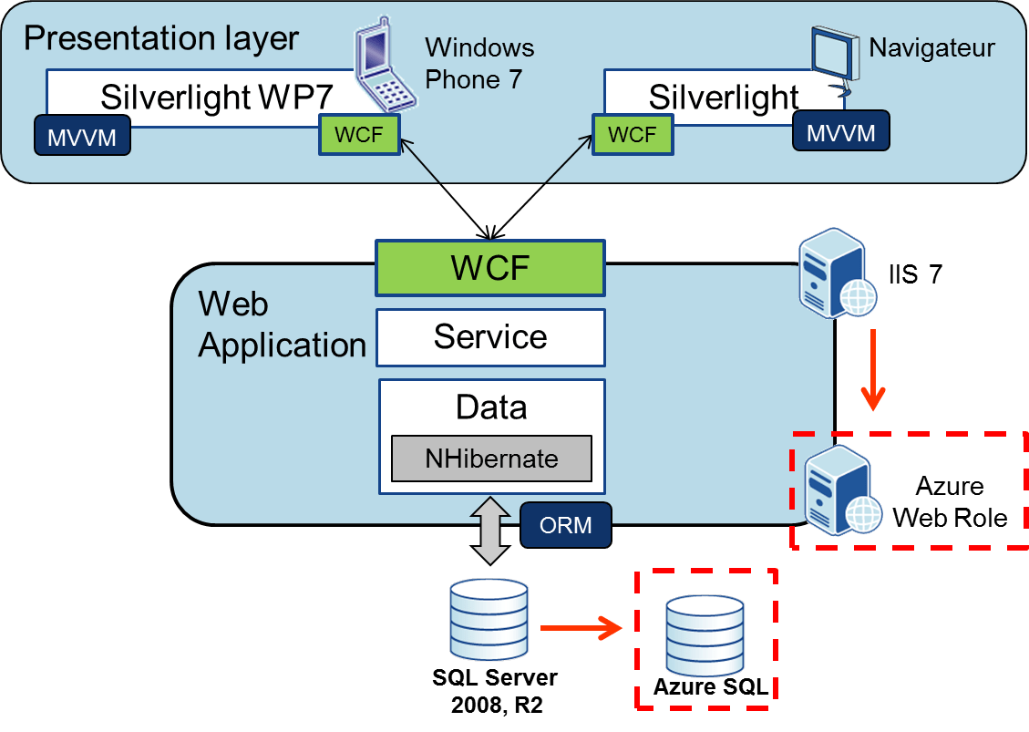 As you can see from the diagram, the application uses NHibernate as ORM(Object Relational Mapping) to access the data. One of the questions we had was: will NHibernate work with Azure SQL? Well the answer is yes. Because Azure SQL is very similar to SQL Server 2008, no configuration changes are needed and the same data provider can be used. Just change the connection string and you are ready to go.