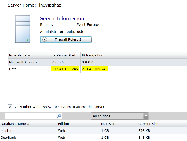 Before we start the move we have to Create new database in Azure Management Portal. When creating the database, the developer has to define which IP addresses will be able to access the database. Generally the database is accessed from Web or Worker role which are on the same Virtual Network created by Azure. However for the development purposes we have to sometimes access the database directly using SQL Server Management studio or other tool. For this situations Azure offers firewall which can be customized to control the incoming trafic. After the creation of the database a connection string is generated which can be used to access the database. The following screenshot comes from the database management portal, highlighting the firewall rule which allows remote access to the database.