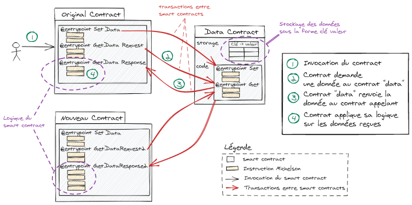Ce schéma illustre la situation décrite précédemment (liée aux entrypoints du contrat). Les lignes en rouge doivent utiliser “get_entrypoint_opt” , celles en noires peuvent utiliser “get_contract_opt” car la totalité de l’interface du contrat est connue.