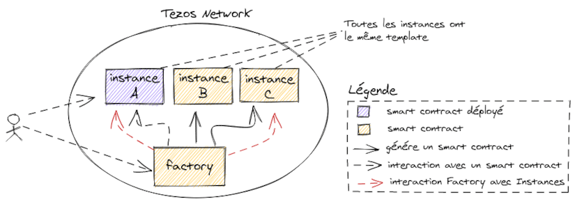 Par exemple, dans le cas d’un “smart contract” ZOO déjà déployé permettant de référencer les animaux d’un zoo (sous la forme d’un token non fongible avec un standard FA2). Le client souhaite pouvoir échanger des animaux avec d’autres zoos. Le contrat déployé ZOO gère les activités au sein d’un zoo mais ne peut pas gérer plusieurs zoos. Il est alors envisageable de mettre en place un pattern de Factory permettant de :
