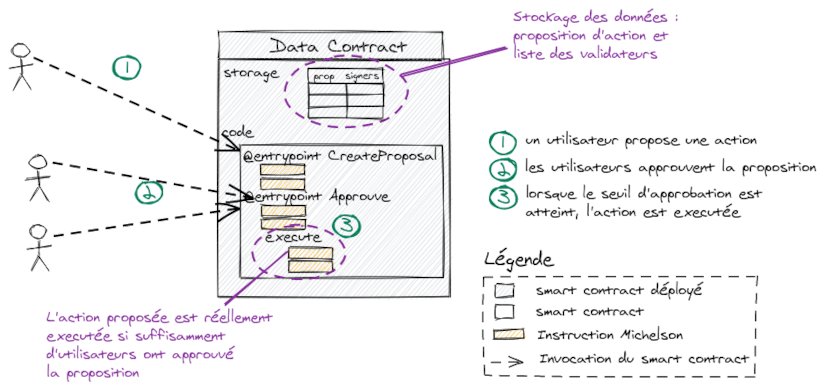Pour rappel, le pattern MultiSig permet d'exécuter une action si suffisamment d'utilisateurs ont donné leur accord. Ce pattern est utilisé lorsque la gouvernance est partagée entre les utilisateurs.