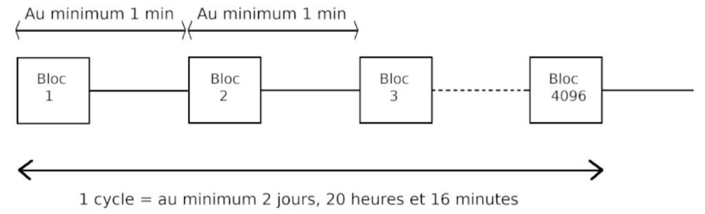 Avant d’expliquer le fonctionnement de ce processus d’amendement, il convient de définir le terme de cycle. Le cycle est l’unité de temps utilisé par Tezos. On dit qu’un cycle s’est écoulé lorsque 4096 blocs ont été créés. Sachant que le temps de création entre deux blocs est d’au moins 1 minute, un cycle dure au minimum 2 jours, 20 heures et 16 minutes.