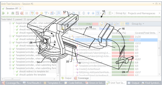This way is faster than trying immediately to write isolated tests on the code : instead of creating a complex grid of mock objects to try to get rid of external dependencies, we use approval tests as a temporary workaround that helps us to secure the first refactoring actions. In this heuristic, the tests we write help us efficiently secure the changes we make to the code, just like a vise that constrain a mechanical piece we are working on.