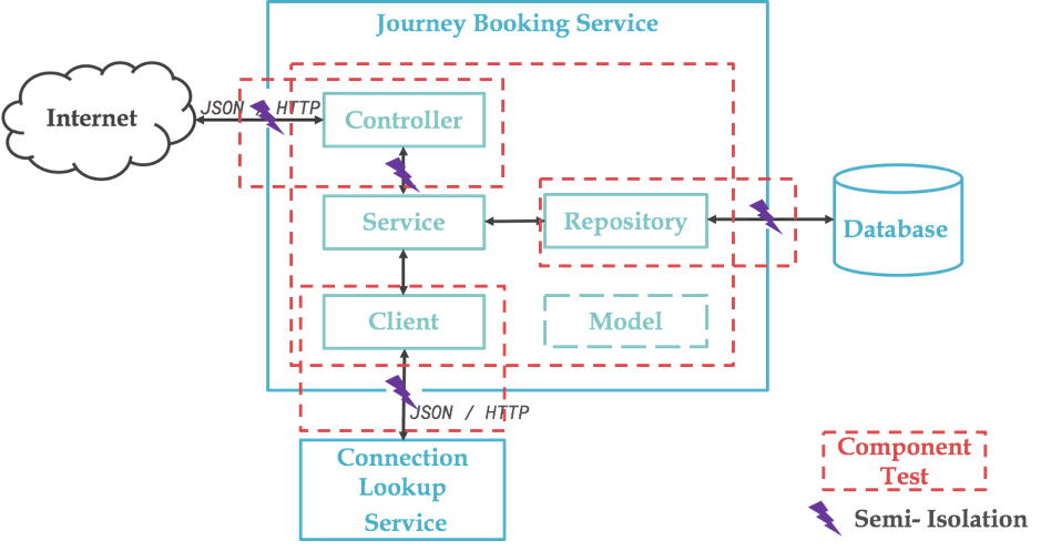 These tests will seem very similar to unit tests, but they validate something quite different. In particular, notice that if we compare the two (TU, TC), we can see that the component tests validate the glue around the Controller (i.e. HTTP, deserialization, validation) materialized by the annotations, while the unit tests validate the “business logic".