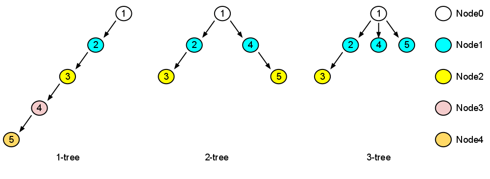 La construction des arbres se fait récursivement et équitablement entre les fils d'un nœud. Ci-dessous trois exemples d'arbre à 5 nœuds avec, de gauche à droite, des tailles de fratries de 1, 2 et 3. Les numéros sont présents à titre indicatif et indiquent l'ordre de création des nœuds par l'algorithme de construction.