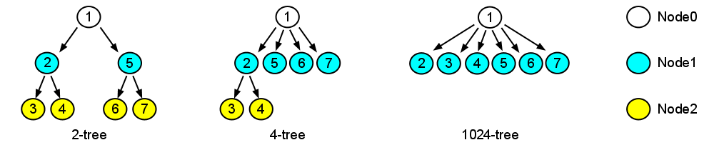 En effet, si la cardinalité des fratries est supérieure au nombre de nœuds n, on obtient un arbre à deux niveaux, une racine Node0 et n-1 enfants Node1. Les 1024-trees de cet article ont tous cette structure car n est toujours inférieur à 1024.