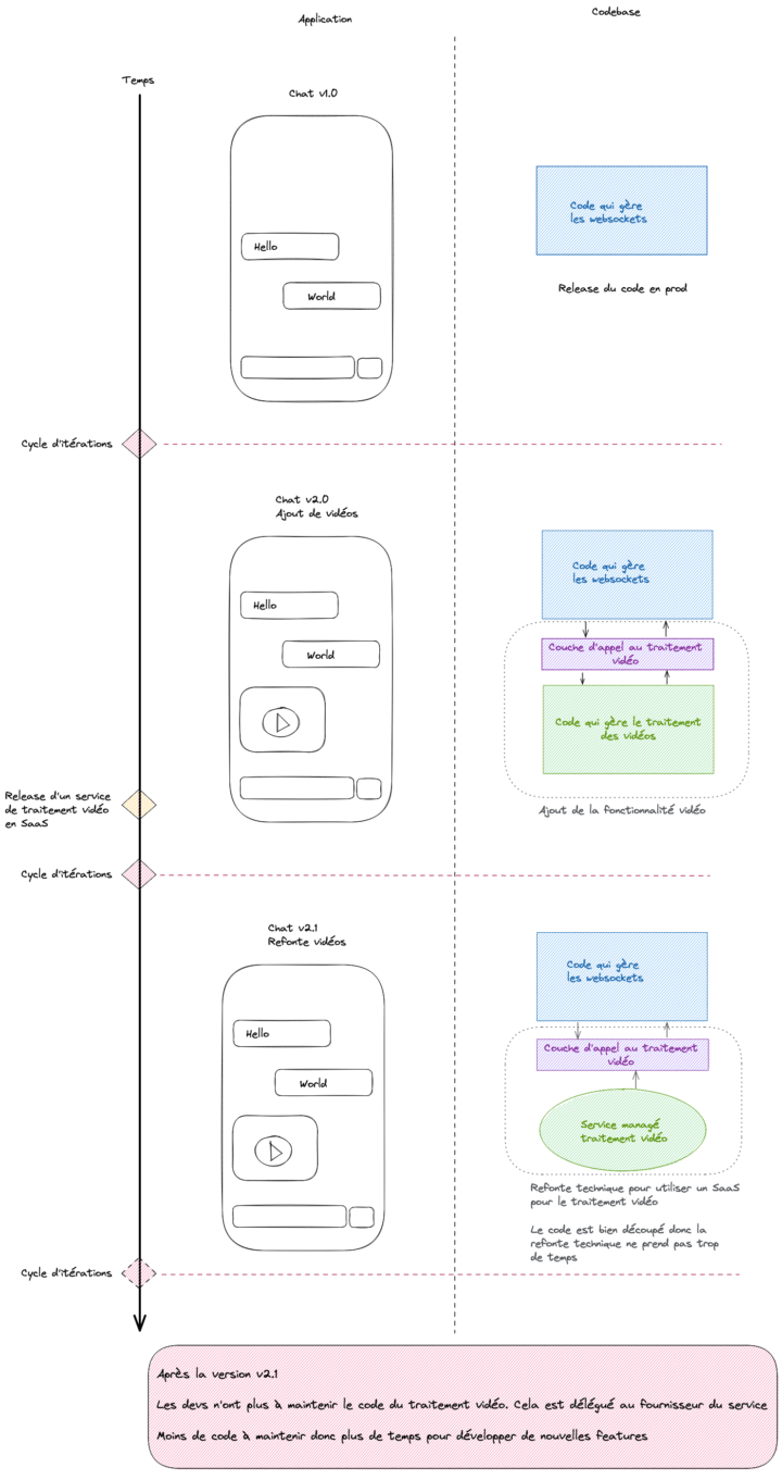 Voici un exemple d'application en constante évolution: une application de messagerie instantanée qui permet d’envoyer des messages textuels. Quelques itérations plus tard, il est possible d’envoyer des vidéos. Le design de l’application repose en grande partie sur des services managés de computing, puis un nouveau service managé Serverless arrive et permet de répondre au besoin de traitement des fichiers vidéos . Alors, l’application peut être repensée pour tirer parti de ce nouveau service et c’est là que le Serverless est très intéressant puisqu’il permet de refondre des parties de l’application de manière rapide et peu coûteuse.