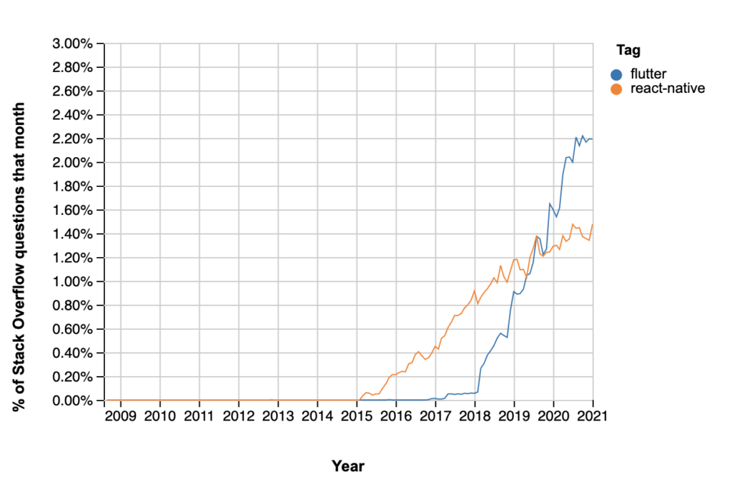 En 2021, les choses ont plus que changé, et l’opinion sur Flutter ne cesse d’aller en s’améliorant. Avec 114 000 “stars” sur Github [9], Flutter fait mieux que React Native (94 000 “stars” [10]). Avec 78 000 questions sur Stack Overflow [11], Flutter rivalise clairement avec les 95 000 liées à React Native [12] (à titre de comparaison, Xamarin n’en compte que 45 000 [13]). Mais plus encore, ce sont les trends de Stack Overflow [14] qui permettent de mesurer l’ascension du framework. En 2018, 0,8% des questions Stack Overflow étaient liées à React Native, et seulement 0,1% à Flutter. En 2021, ce sont 1,35% des questions qui sont liées à React Native, contre 2,2% pour Flutter. Il y a donc dans ce même laps de temps 69% de questions supplémentaires concernant React Native contre 2200% pour Flutter.