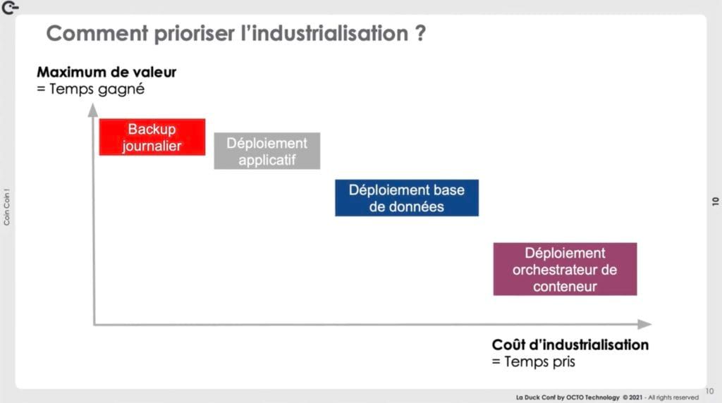 Pour cela, il faut réfléchir à la priorisation. L’équipe SRE a opté pour le faire de la même façon que pour prioriser du fonctionnel, en rapprochant le coût à la valeur. Coût : le temps à mettre en œuvre pour l'industrialisation. Valeur : le temps qui est gagné de manière répétitive car l'industrialisation supprime cette tâche.