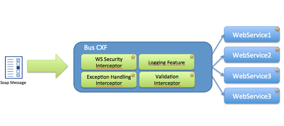 Lorsqu'on met en place un ensemble de WebServices, on peut être amené à effectuer un traitement commun à tous ces web services. Par exemple, rattraper les exceptions et maîtriser la soap:foault qui sera renvoyée au client. Ce type de traitement peut être réalisé de diverses façons, mais une bonne pratique est d'utiliser des intercepteurs.