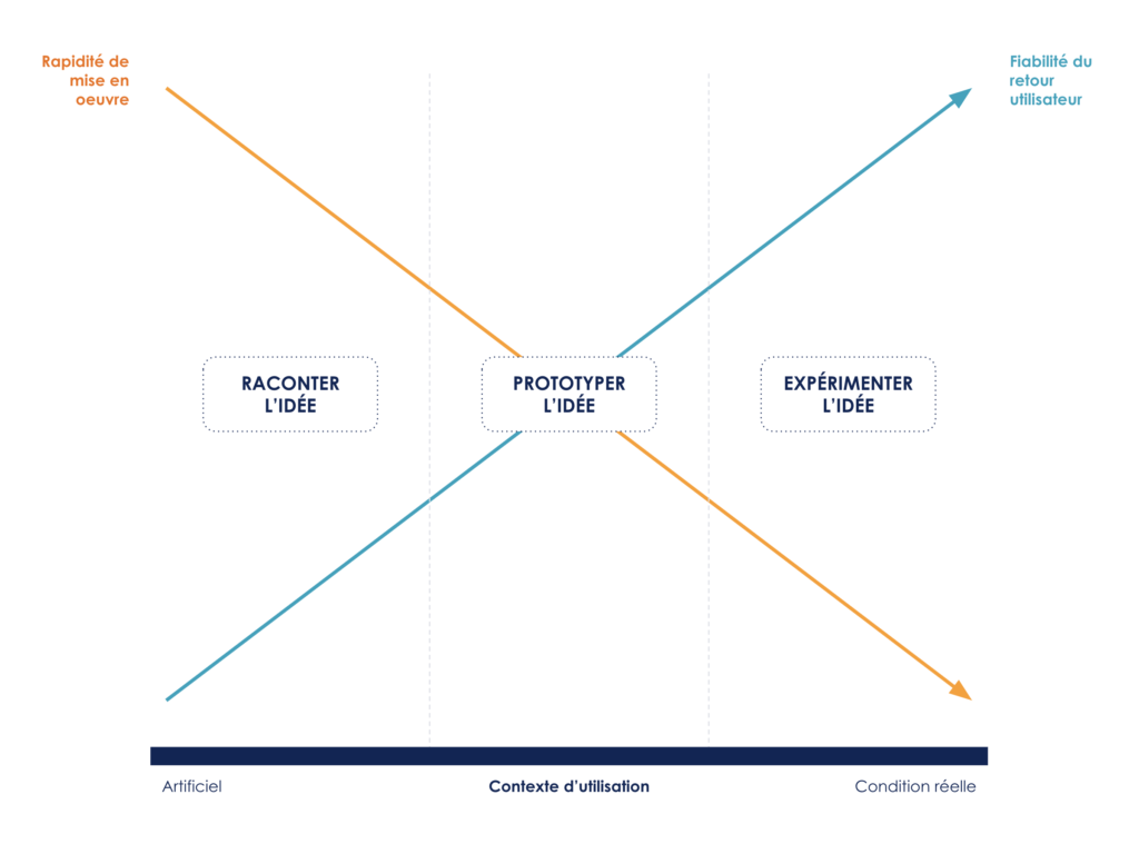 Il faut trouver le juste équilibre entre le temps investi pour rendre cette idée présentable et la fiabilité du retour que l’on souhaite avoir. Plus on se rapproche des conditions réelles d’interaction avec la solution et moins on influence la prise de décision des utilisateurs, plus les retours récoltés seront fiables. Nous identifions trois grandes manières de présenter une idée aux utilisateurs, positionnées sur un double axe “rapidité de mise en œuvre” et "fiabilité des retours utilisateurs” : 1. Raconter l’idée, 2. Créer un prototype pour simuler l’idée et 3. Expérimenter l’idée en conditions réelles.