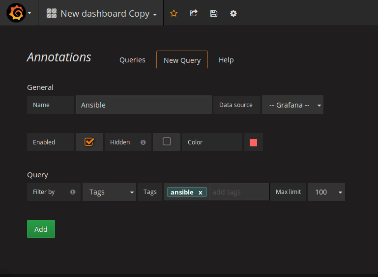 We define a query performed in Grafana’s native store, and the query filters the annotations by tags. It means that our query will look for annotations tagged with the value “ansible”, which is one of the tags defined by our callback for all annotations.