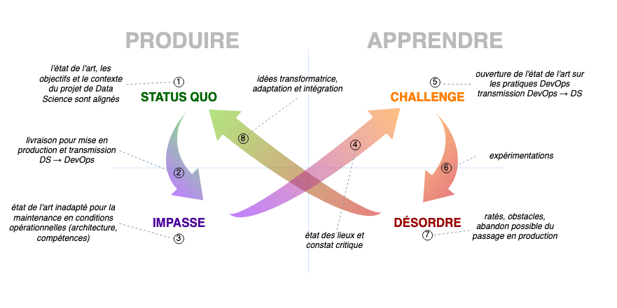 Un projet de Machine Learning qui ne va pas en production se trouve précisément dans cette phase, où l'apprentissage n'est pas converti en valeur ajoutée pour l'entreprise. Il ne l’est pas parce qu'il manque l'intégration d'une idée transformatrice, une adaptation à la fois à la nouveauté du projet et à l'existant de l'entreprise, une idée qui aiderait à surmonter les blocages, les inquiétudes, les réactions de rejet a priori, mais aussi les contraintes de l'entreprise. Le travail non seulement de l'ambassadeur (et pourquoi pas de l'équipe entière) a pour but cette adaptation, afin que la recherche aboutisse en un développement effectif au lieu de s'arrêter à la porte du laboratoire. Une fois cette phase d'intégration réalisée, l'entreprise s'est "Data-Scientisée", et le Data Scientist s'est un peu plus "fondu" dans l'entreprise. Un nouveau Status Quo a lieu, et le cycle recommence. Ce cycle peut être schématisé au moyen de la carte de polarité ci-dessous: