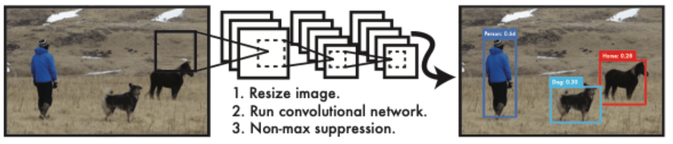 L'approche implique un réseau de neurones qui met bout-à-bout une multitude de neurones et qui prend une photo en entrée et prédit directement les cadres de délimitation, plus communément appelés "bounding box", et les étiquettes de classe pour chaque cadre de délimitation.