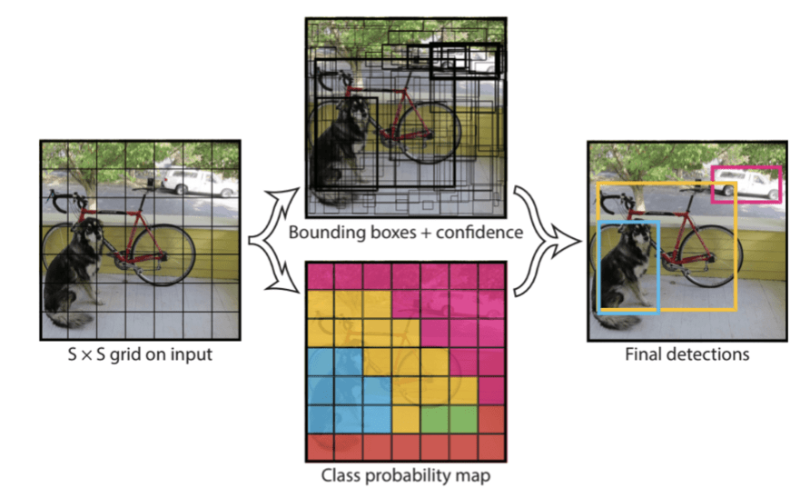 Par exemple, une image peut être divisée en une grille 7 × 7 et imaginons que chaque cellule de la grille peut prédire 2 cadres de délimitation, ce qui donne 98 prédictions de cadres de délimitation proposées. La carte des probabilités de classe et les cadres de délimitation avec confiance sont ensuite combinés en un ensemble final de cadres de délimitation et d'étiquettes de classe. L'image ci-dessous résume les deux sorties du modèle.