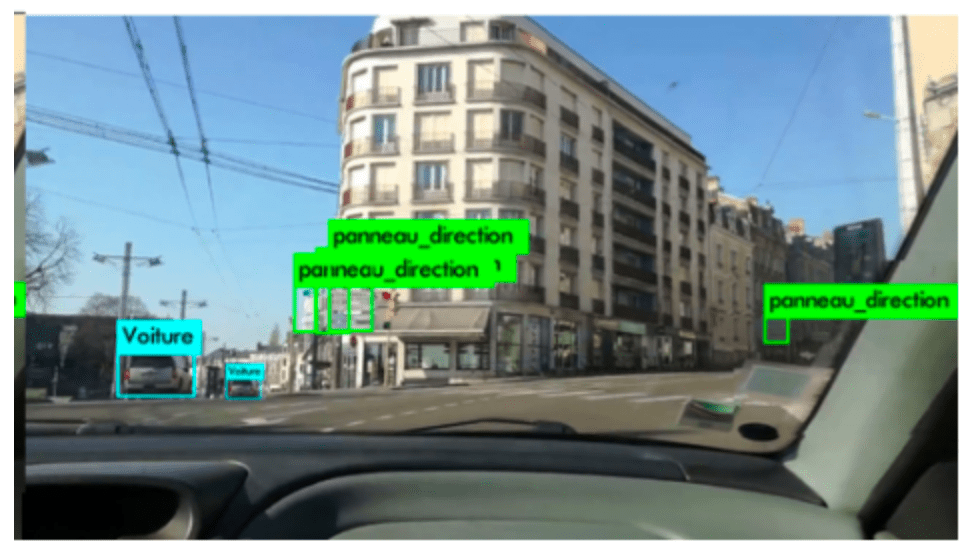 En effet, après avoir installé une caméra dans une voiture en déplacement et après avoir récupéré les images prise par la caméra, YOLO nous a permis de faire de la détection d’objets sur la route tels que les feux tricolores, les panneaux de direction, les piétons ainsi que les voitures.